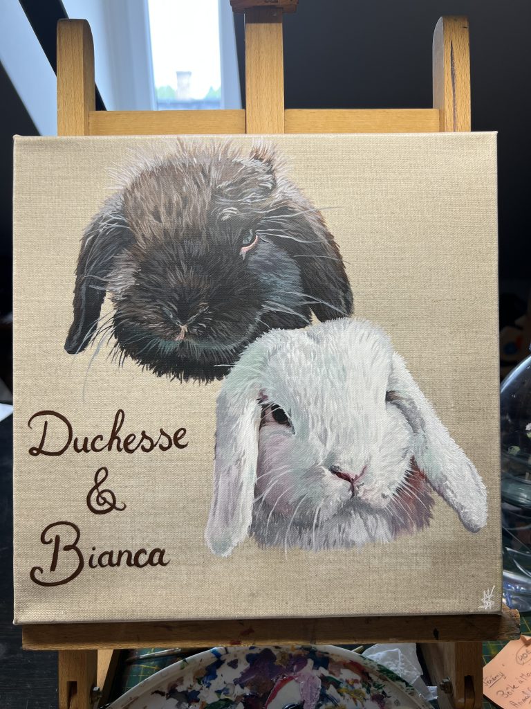 Portrait sur rond 7,5 cm – Lapin nain noir et grisDouble portrait sur tableau 20×20Portrait sur rond 7,5 cm – Lapin bélier BlancPortrait sur rond 7,5 cm – Lapin bélier Blanc et NoirTableau 20×20 – Lapin bélier tricoloreDouble portrait sur toile lin 30×30 – Lapins bélier brun et blanc